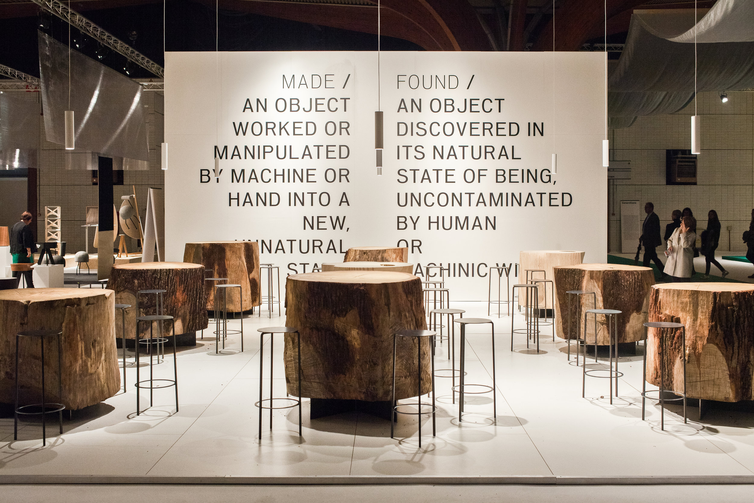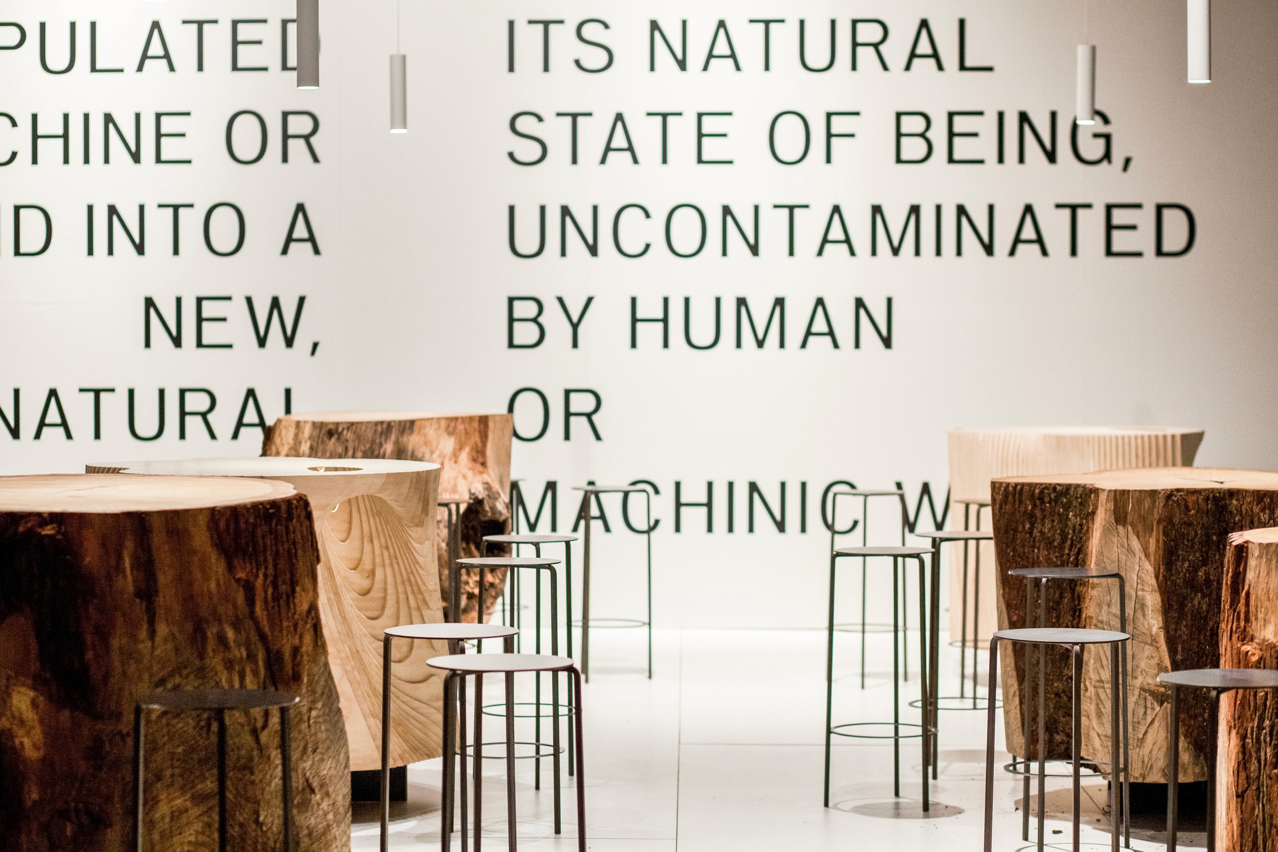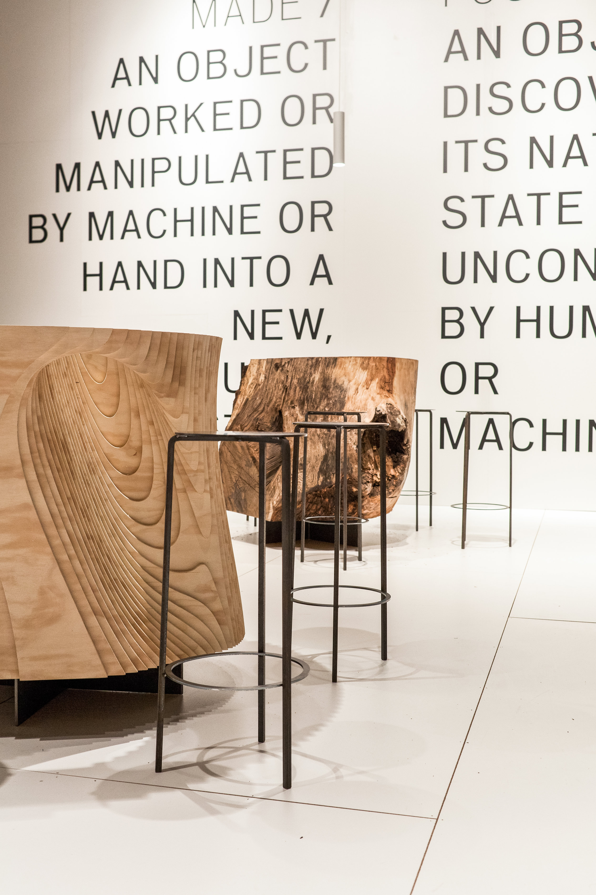 The concept was organized around the simple directive of Made vs. Found. A grid of objects. Half found, and half made. Positioned on a raised platform, 9 objects sat on a grid of steel brackets. Using the forest as a medium, the grid of objects was a mixture of found tree stumps and made digital wood stumps. Exposing the dichotomy between objects sourced directly from nature and those undergoing a process of man or machinic manipulation, the space invited visitors to explore these two realms.