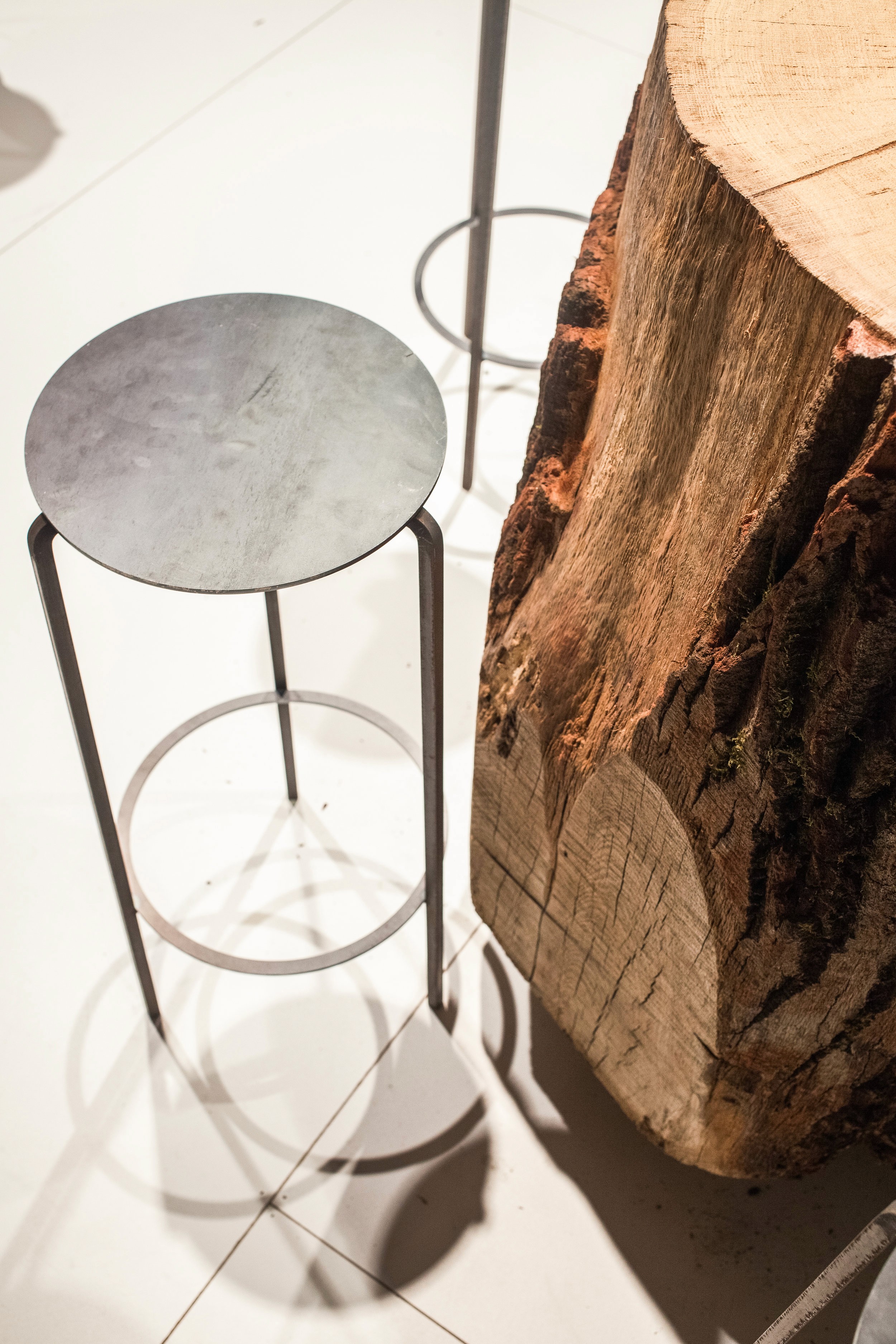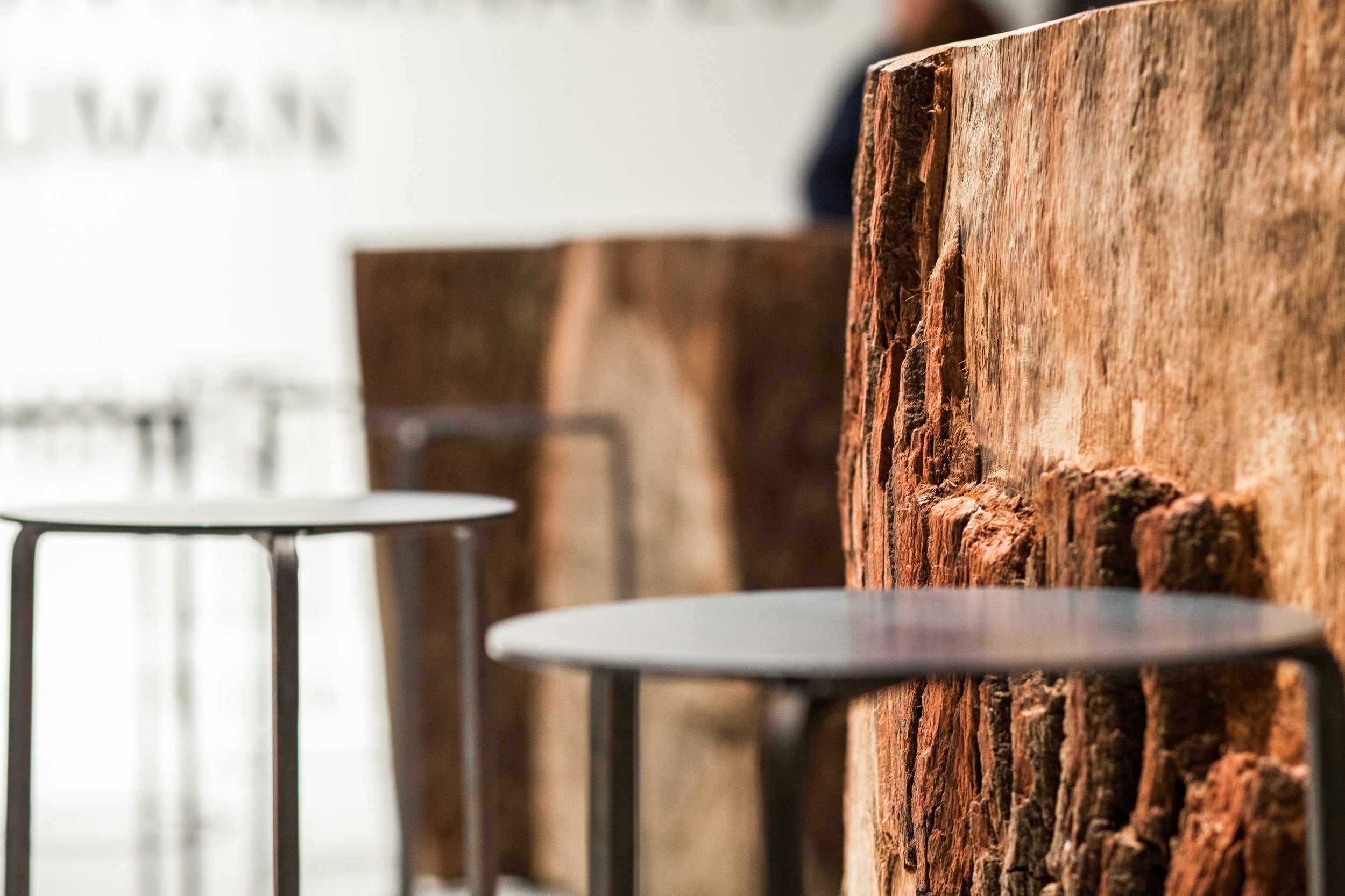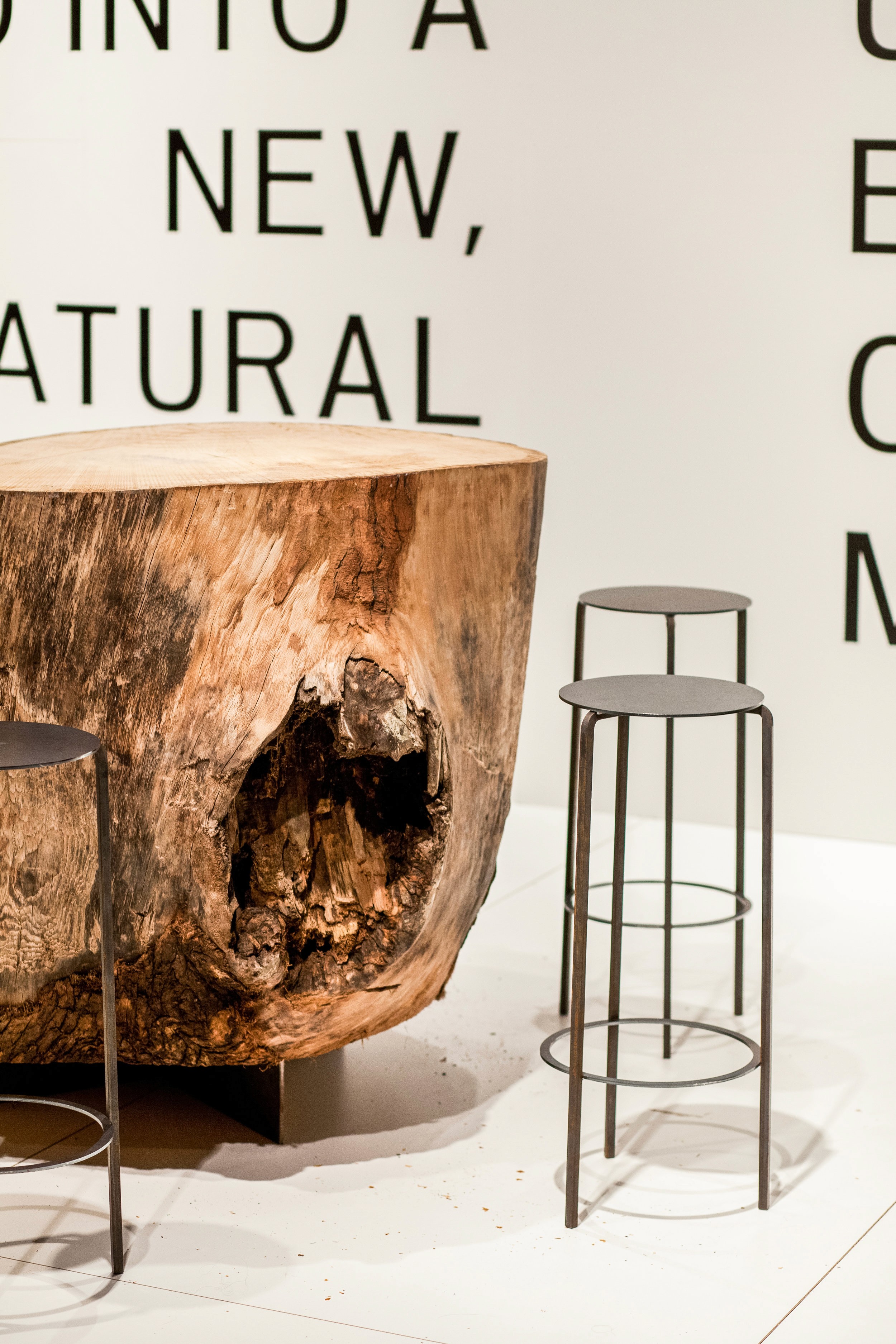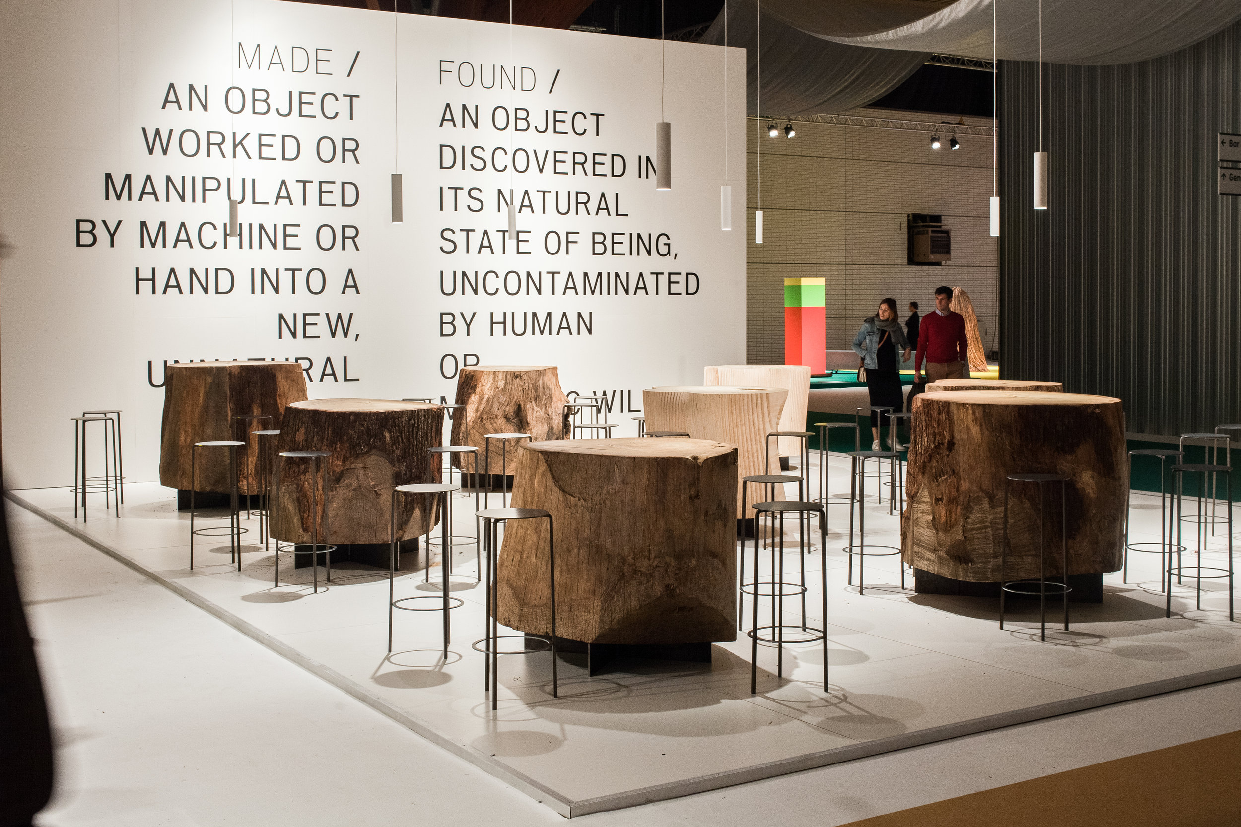 The concept was organized around the simple directive of Made vs. Found. A grid of objects. Half found, and half made. Positioned on a raised platform, 9 objects sat on a grid of steel brackets. Using the forest as a medium, the grid of objects was a mixture of found tree stumps and made digital wood stumps. Exposing the dichotomy between objects sourced directly from nature and those undergoing a process of man or machinic manipulation, the space invited visitors to explore these two realms.