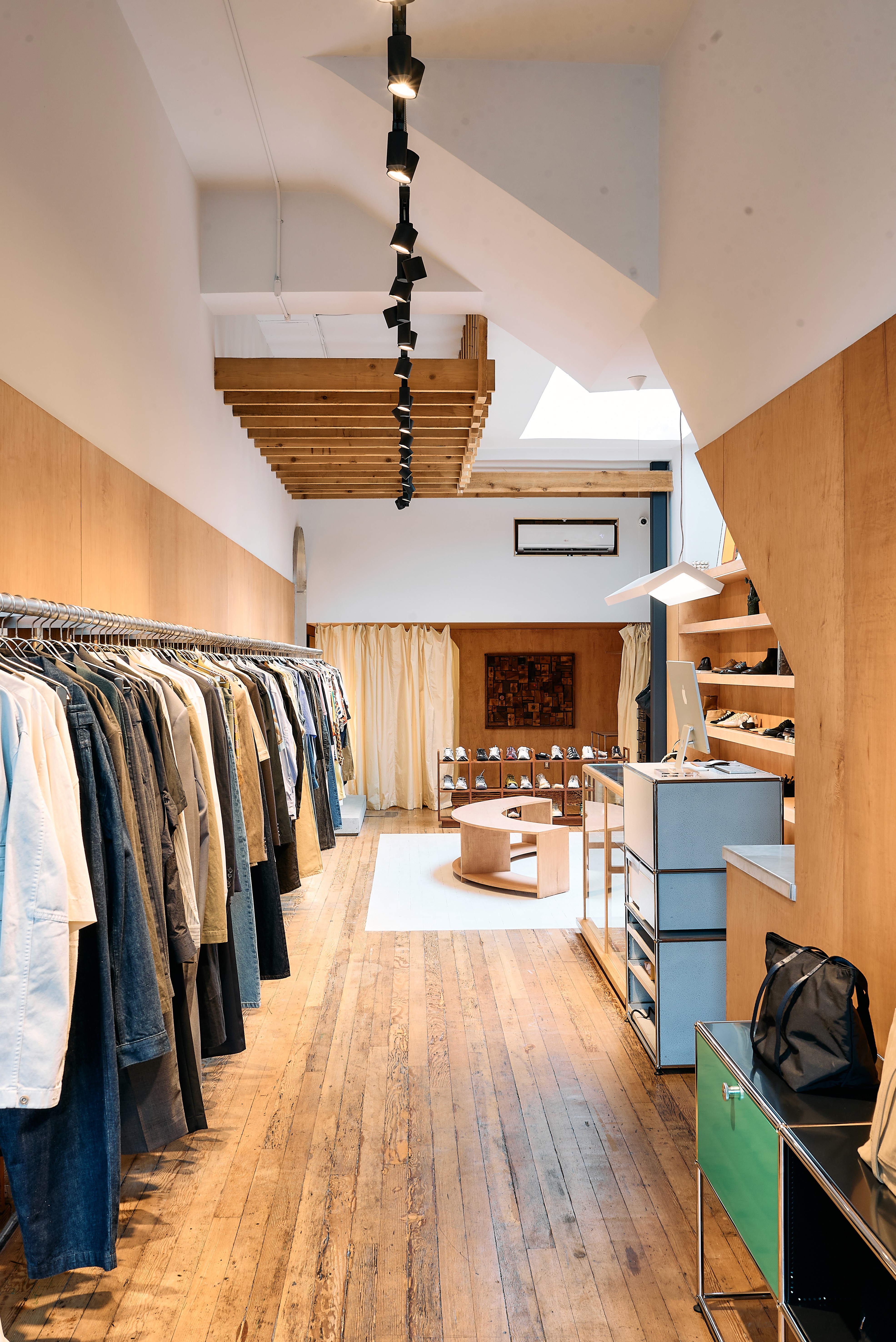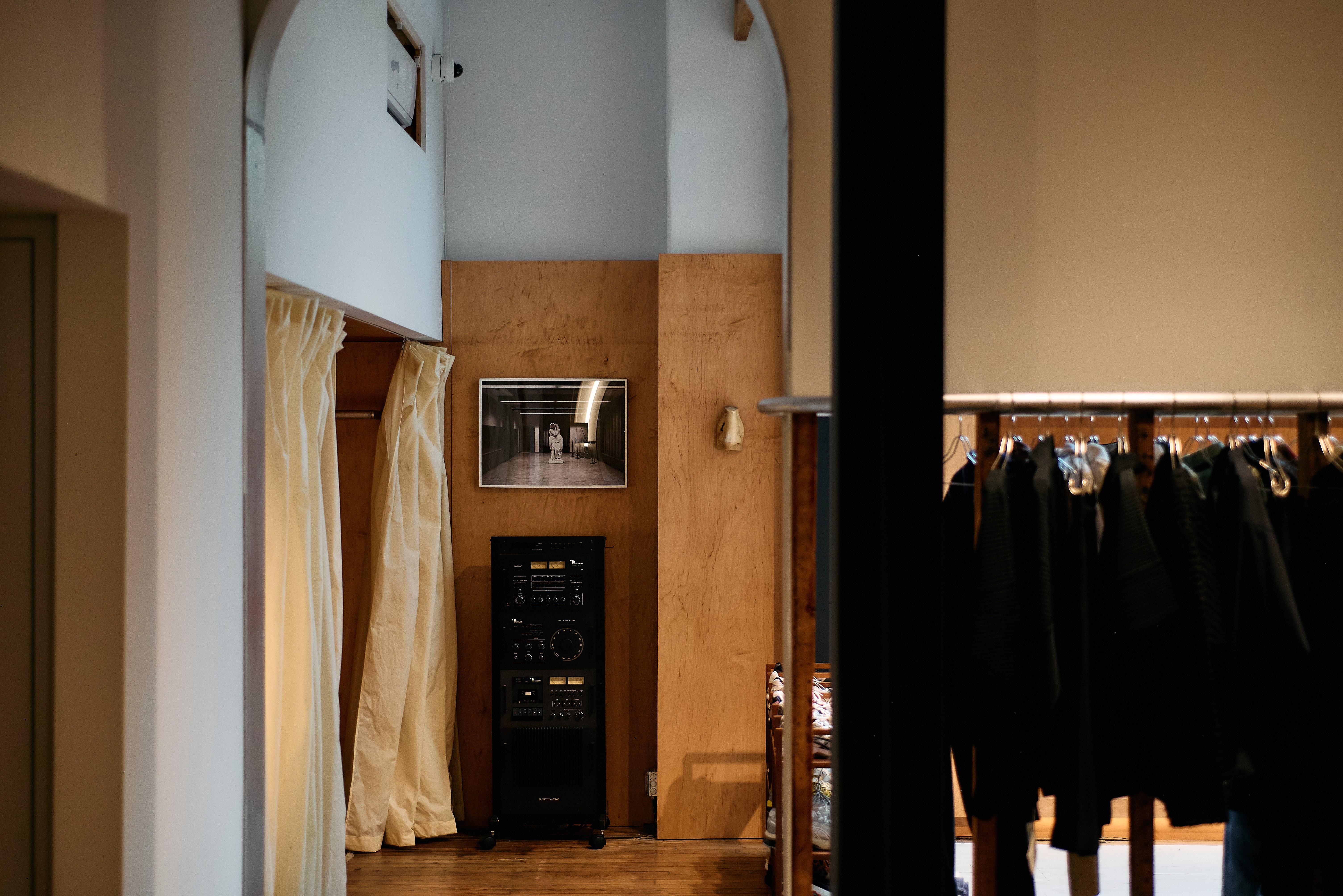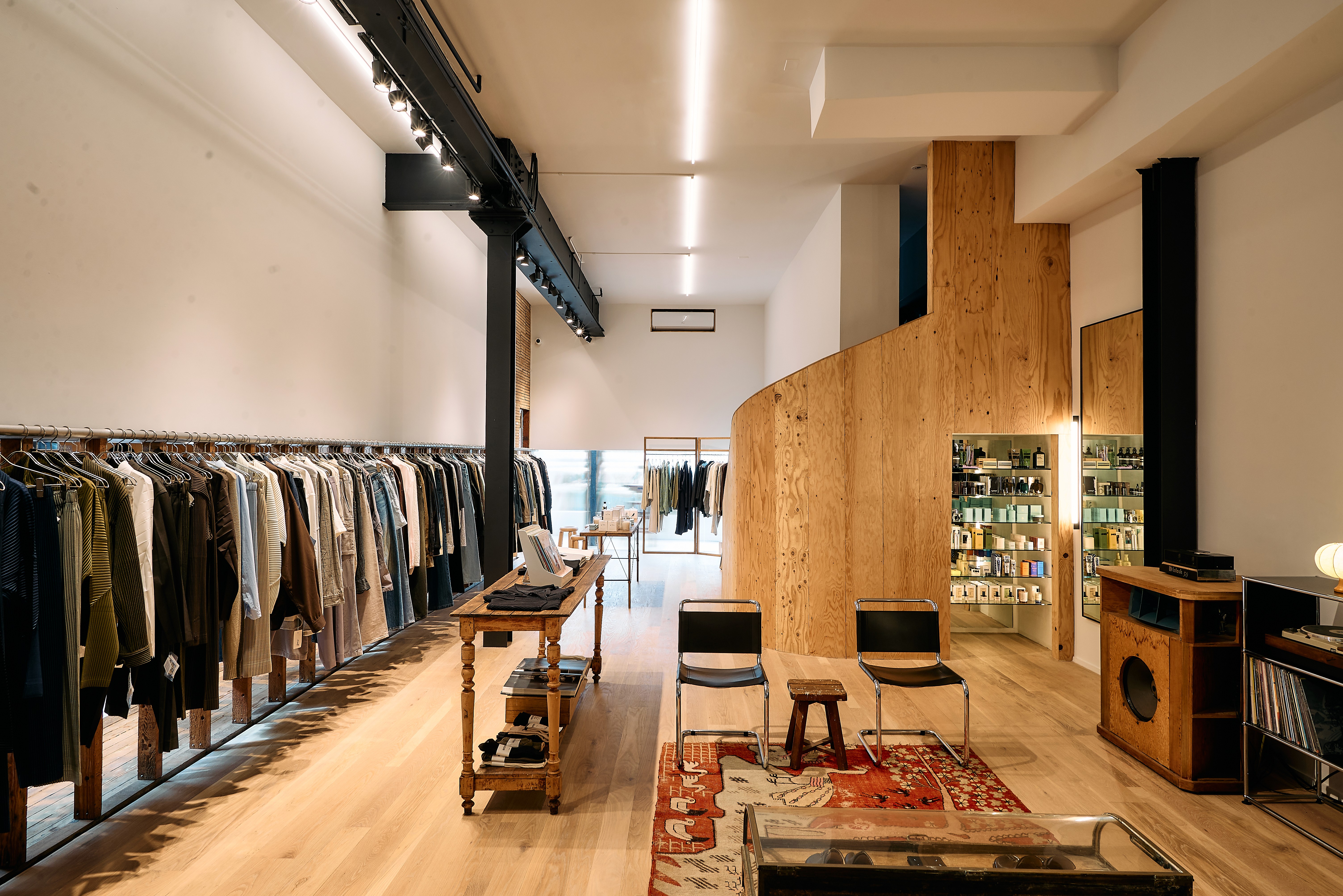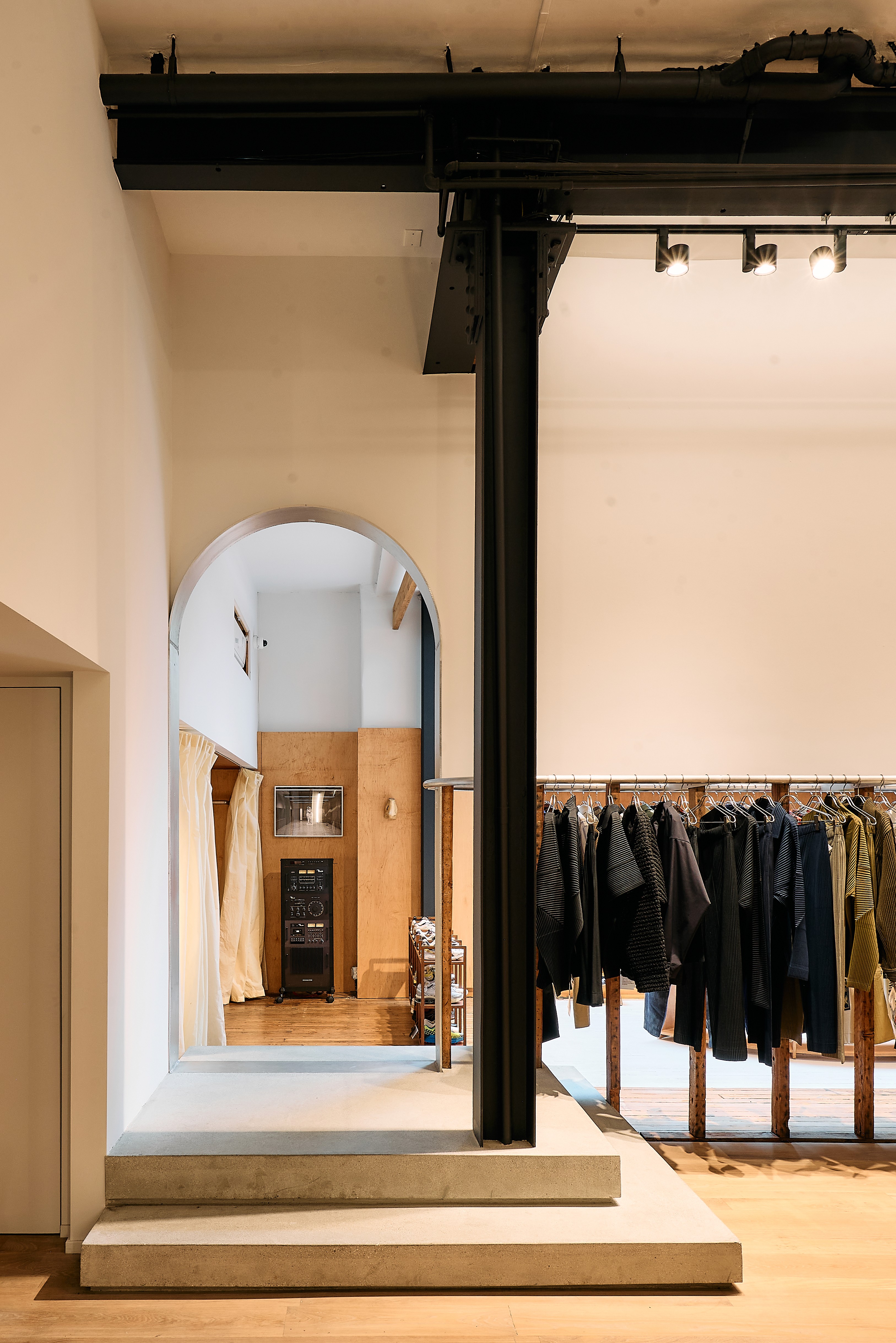 We had a rare and beautiful opportunity in the past few months to work alongside a dear friend, to bring his LA staple into its next life stage. By peeling off layers of building materials, we worked to connect and expose two adjacent spaces into one coherent whole. A bespoke solid aluminum hanging rail and an arched framed opening juxtapose against the bones of the original building.